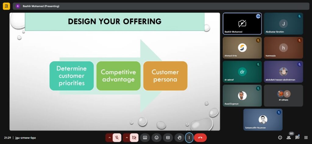 Center for Creativity, Entrepreneurship, and Innovation (CCEI) at Mogadishu University organized a training session titled โBusiness Startup Guide,โ aimed at promoting youth involvement in startups. This training provided an invaluable opportunity for students interested in business and entrepreneurship. Key topics covered included business planning, financial management, and the common challenges faced by new entrepreneurs.
